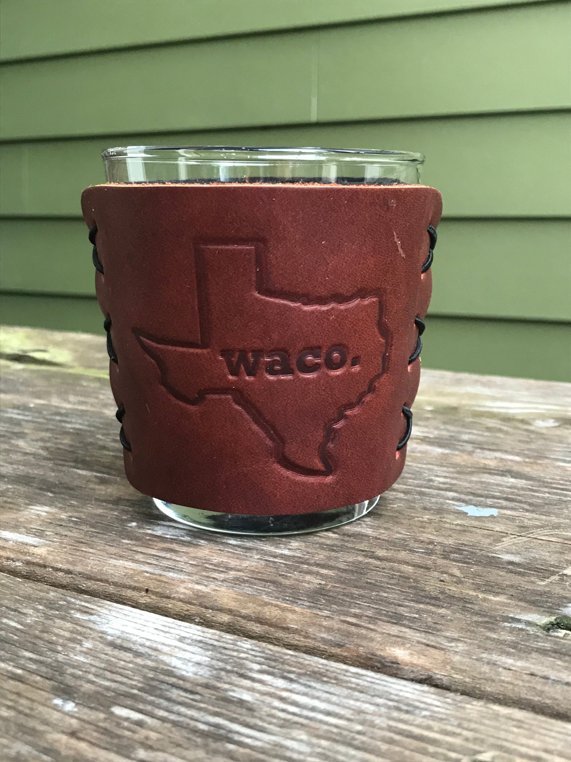 A 13 ounce thick bottomed glass with neoprene insulated leather sleeve. Our leather whiskey sleeves wrap around the glass and snap together with 3 vertical snaps. Stamped with one of our stock designs or a custom design.